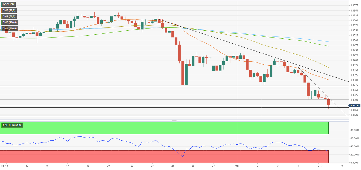 GBP/USD has started the new week under strong bearish pressure with the greenback capitalizing on safe-haven flows. The pair was last seen testing the 1.3160 support and additional losses are likely in case this level turns into resistance.