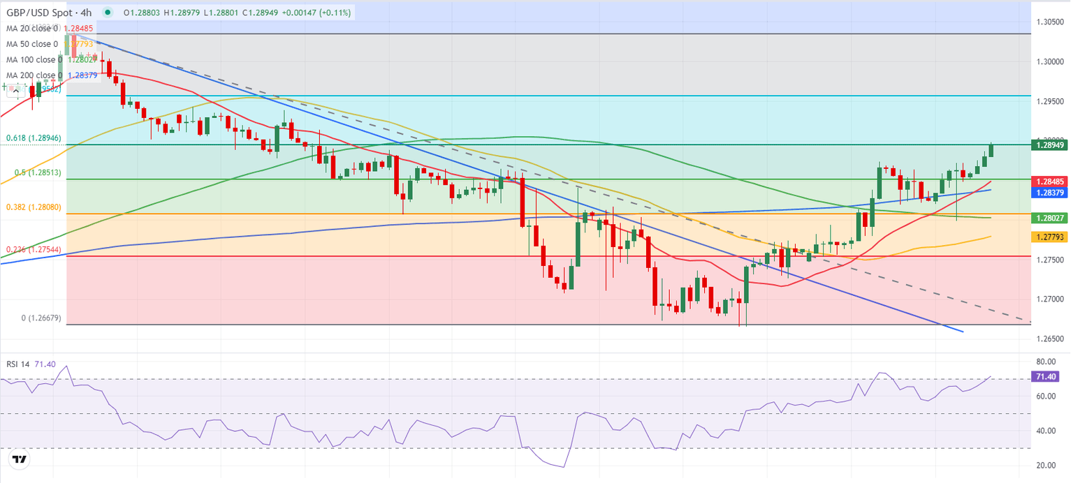 GBP/USD preserves its bullish momentum and trades at its highest level in three weeks slightly below 1.2900 in the European session on Friday. In the absence of high-impact data releases, the risk perception could impact the pair's action in the second half of the day.