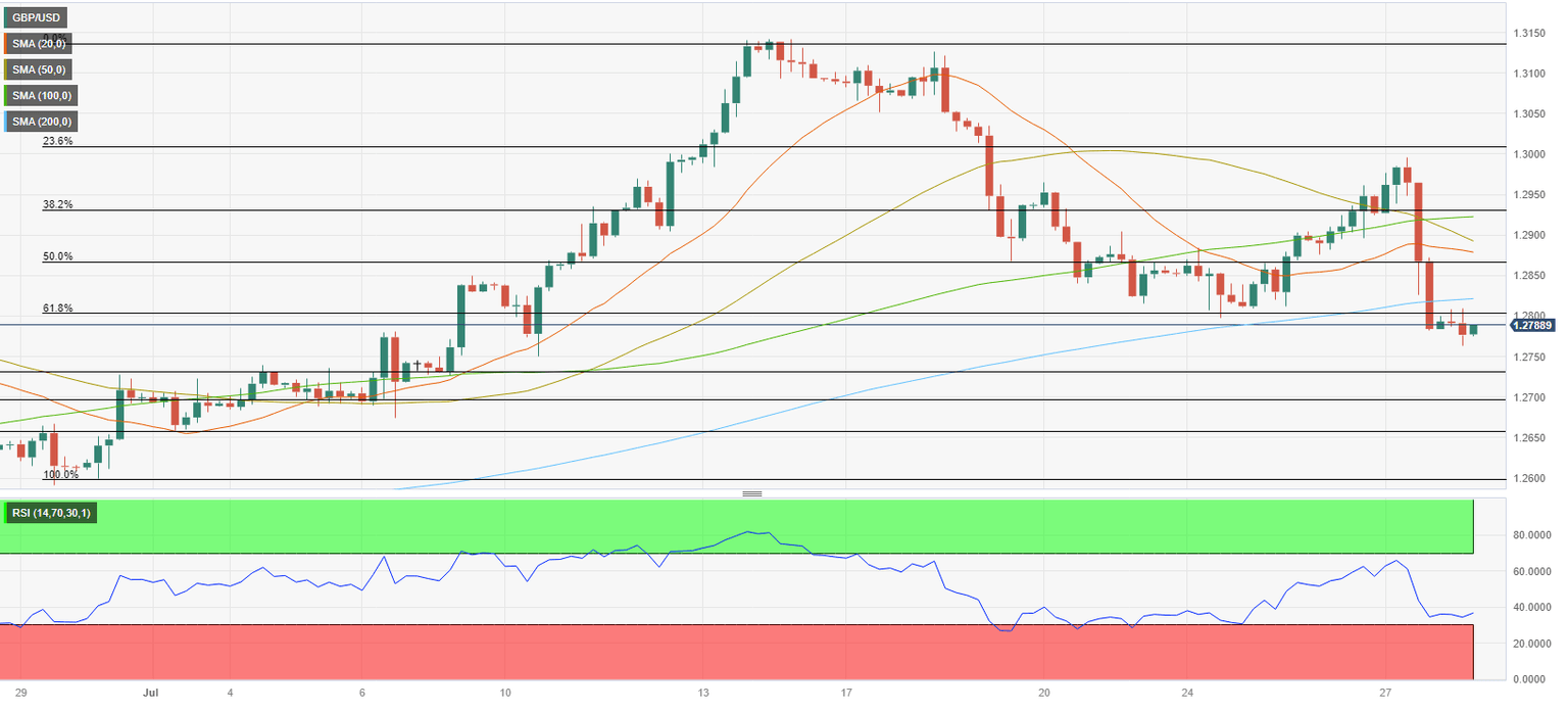 GBP/USD broke below 1.2800-1.2810 area, where the Fibonacci 61.8% retracement level of the latest uptrend and the 200-period Simple Moving Average align. Meanwhile, the Relative Strength Index (RSI) indicator on the 4-hour chart stays between 30 and 40, suggesting that the pair has more room on the downside before turning technically oversold.