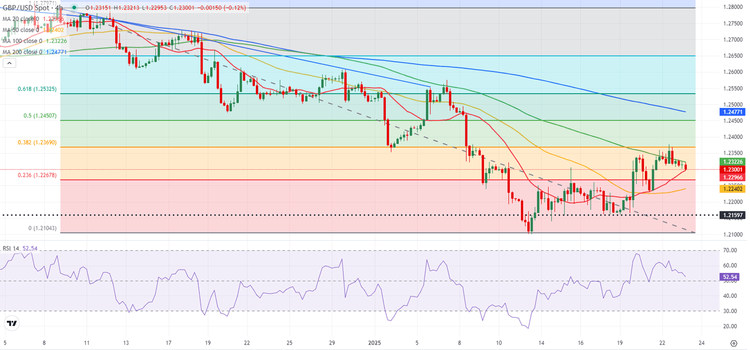 The Relative Strength Index indicator on the 4-hour chart retreats toward 50 and GBP/USD remains below the 100-period Simple Moving Average (SMA), currently located at 1.2320, after closing the last four candles below that level, reflecting buyers' hesitancy.
