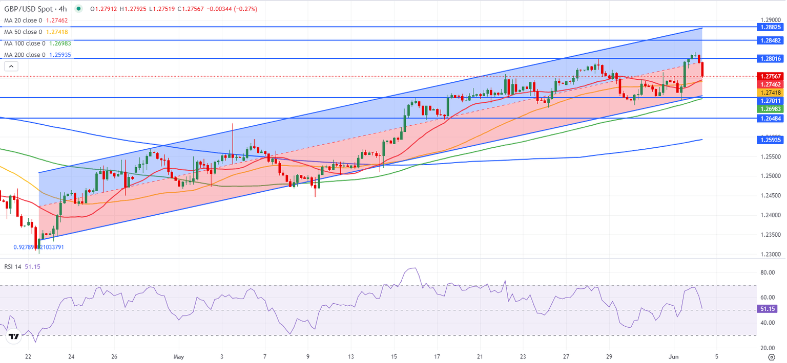 - GBP/USD declined below 1.2800 after posting strong gains on Monday.