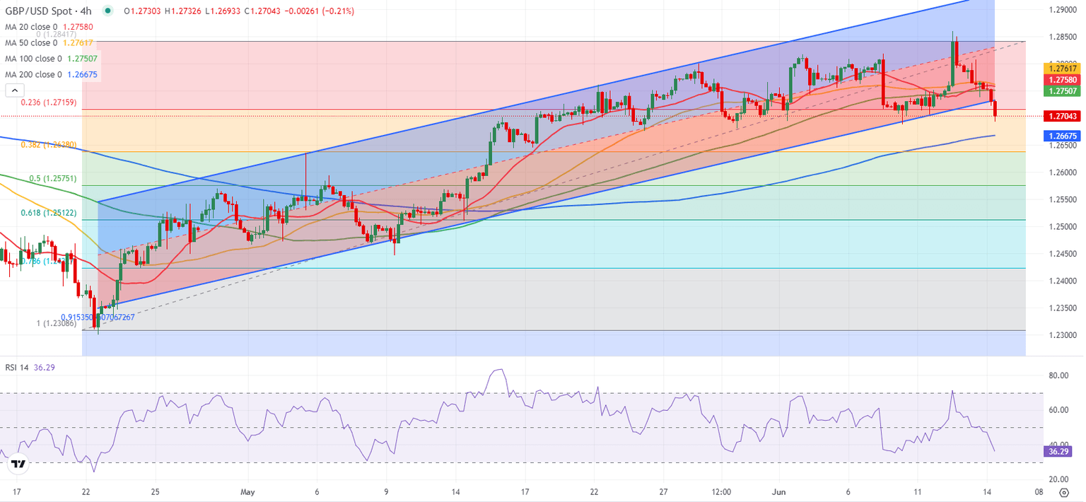 GBP/USD dropped below the lower limit of the ascending regression channel and the Relative Strength Index (RSI) indicator on the 4-hour chart fell below 40, reflecting the bearish tilt in the short term outlook.