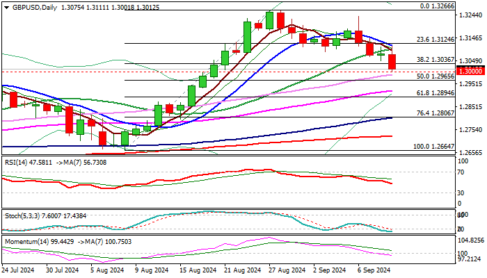 Completion of bearish failure swing pattern on daily chart also contributes to negative signals, with firm break of 1.30 pivot to generate fresh bearish signal and open way towards targets at 1.2965 )50% retracement of 1.2664/1.3266) and 1.2922/1.2894 (55DMA / Fibo 61.8%.