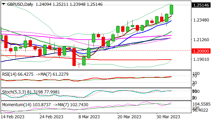 Cable extends step ascend into second straight day, extending broader uptrend above former tops (1.2447) and hit new multi-month high on probe through 1.2500 barrier, for the first time since June 2022.
