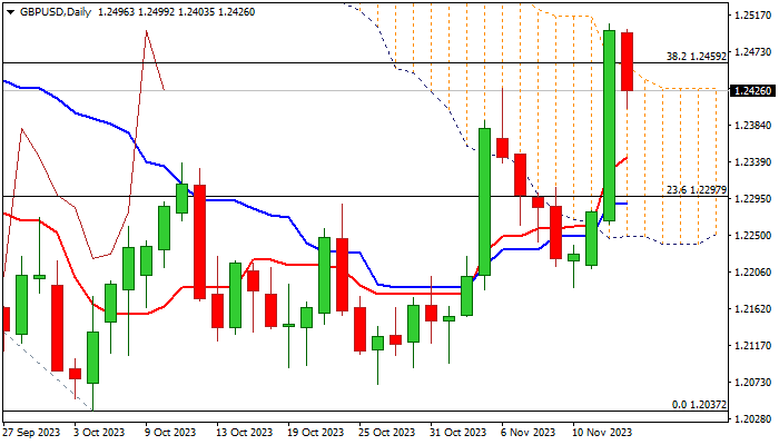 The price fell back into daily Ichimoku cloud (cloud top lays at 1.2439, reinforced by 200DMA) with daily close below here to weaken near-term structure and risk deeper pullback.