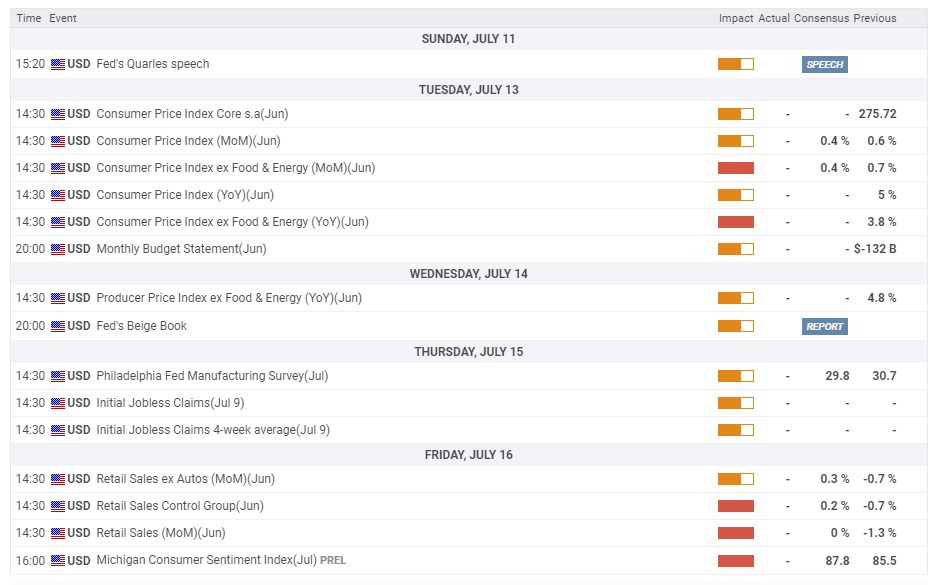 The highlights of the economic calendar are two top-tier publications. On Wednesday, investors will eye the Consumer Price Index (CPI) data for June. Inflation surprised to the upside in May with a jump from 1.8% to 2.1% YoY.