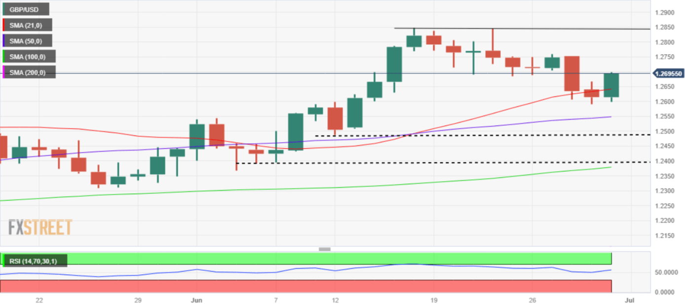 The pair rebounded firmly toward 1.2700 after the US Dollar came under renewed selling pressure after the release of the US PCE inflation data. Inflation in the United States, as measured by the change in Personal Consumption Expenditures (PCE) Price Index, fell to 3.8% on an annual basis in May from 4.3% in April, the US Bureau of Economic Analysis reported on Friday. The market consensus expected a reading of 4.6%. The annual Core PCE Price Index, the Federal Reserve's preferred gauge of inflation, edged lower to 4.6% from 4.7% in the reported period.