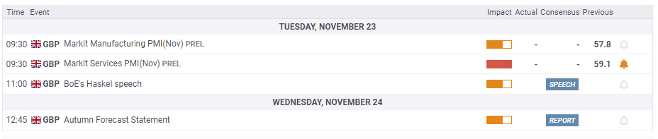 The economic calendar is lighter, but there are several noteworthy events. Preliminary Purhcasing Managers' Indexes for November will likely remain high, pointing to ongoing expansion, despite supply chain issues. Any retreat from the highs could weigh on the pound.