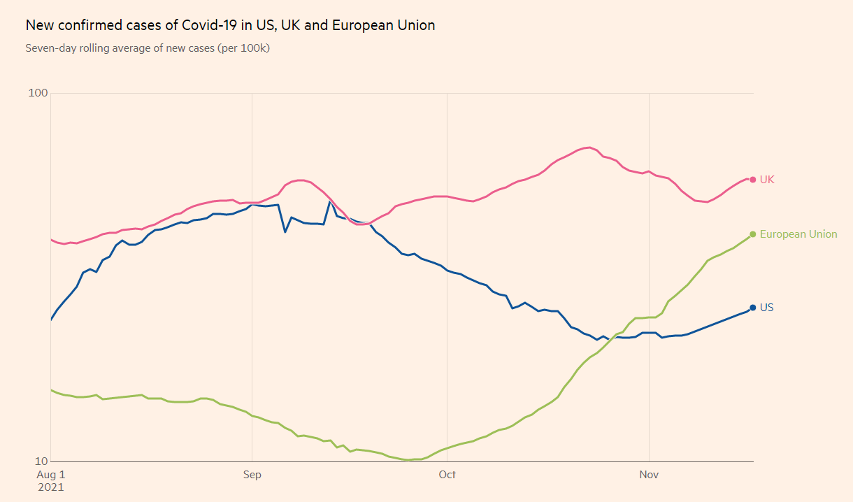 COVID-19 cases remain elevated on both sides of the pond. Still, contrary to several European countries, British and American leaders are reluctant to announce new restrictions, leaving the topic mainly on the sidelines for markets.