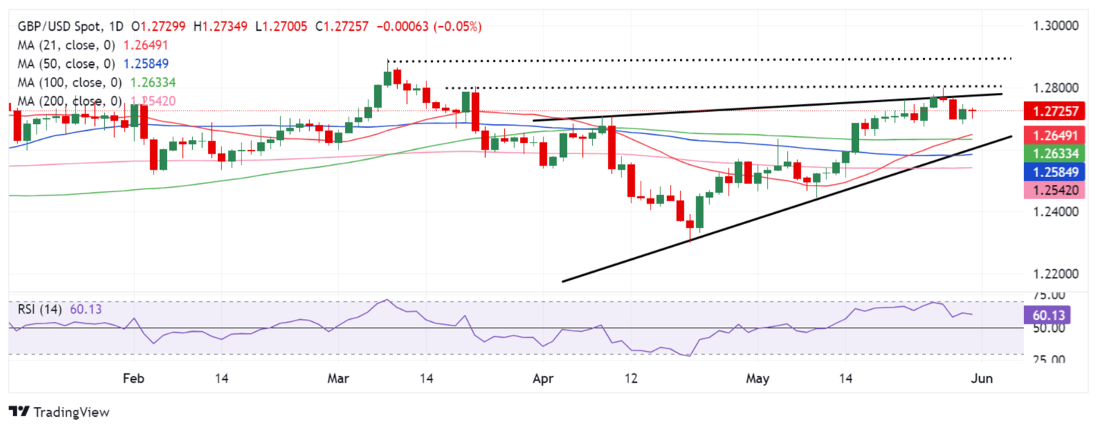 The USD came under modest bearish pressure in the American session on Friday and allowed GBP/USD to recover above 1.2750 after the data showed that inflation, as measured by the change in the PCE Price Index, held steady at 2.7% on a yearly basis in April. This reading matched March's increase and came in line with the market expectation. The core PCE Price Index, which excludes volatile food and energy prices, rose 2.8% on a yearly basis, also meeting analysts' estimates.