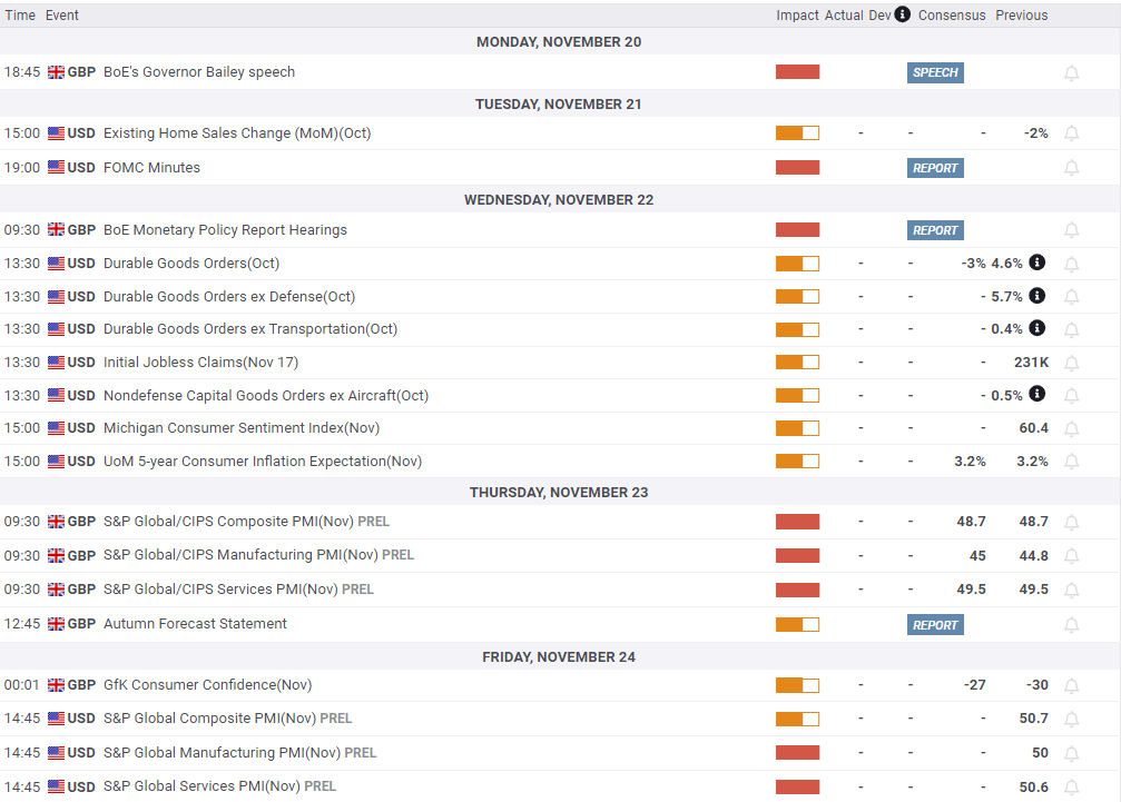 Wednesday will be a busy day, with a couple of top-tier US data releases in the Jobless Claims and Durable Goods Orders. Also of note will be the UK Autumn Statement and BoE monetary policy report hearings, which could ramp up the volatility around the Pound Sterling.
