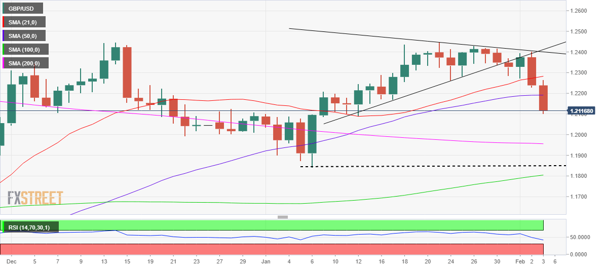 The US Dollar recovery further gained traction on a strong US labor market report, which revived expectations that the US Federal Reserve will continue to hike rates in March and May. Markets also pared bets on potential Fed rate cuts by the end of this year. The US economy added 517K jobs in January as against the expected 185K increase and the 260K previous figure. The US Unemployment Rate dropped to 3.4% in January vs. 3.6% expected and 3.5% previous while the Labor Force Participation rate ticked higher to 62.4% in the reported month. The annual wage inflation, as measured by Average Hourly Earnings, came in at 4.4%, compared to the estimate of 4.9%. The stunning US jobs report intensified the sell-off in GBP/USD, smashing it to the lowest level in three weeks near the 1.2100 mark.
