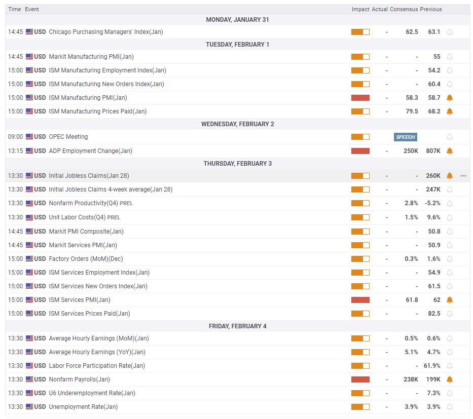 Assuming no substantial safe-haven flows due to events in Eastern Europe, the focus for the dollar is set to be domestic, with a busy week culminating in Nonfarm Payrolls.