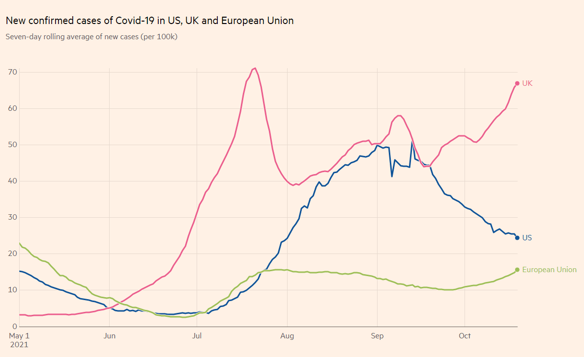 Covid comeback: Jumping back to Britain, coronavirus has unfortunately returned to center-stage. Cases, hospitalizations and also deaths are on the rise, raising fears of new lockdowns. While Health Minister Sajid Javid said there is no intention to enact the government's "Plan B" – returning to pre-"Freedom Day" restrictions – the topic is on traders' minds. An official denial causes worries.