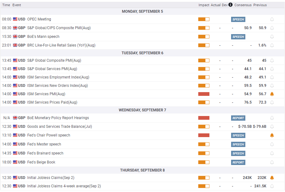 Tuesday will see the US ISM Services PMI release, with the prices paid sub-index once again in focus, as it could confirm peak inflation and affect the Fed rate hike sentiment. Traders will then gear up for the BOE monetary policy report hearings on Wednesday, with eyes on Governor Andrew Bailey and his colleagues’ testimony ahead of the September 15 rate hike decision.