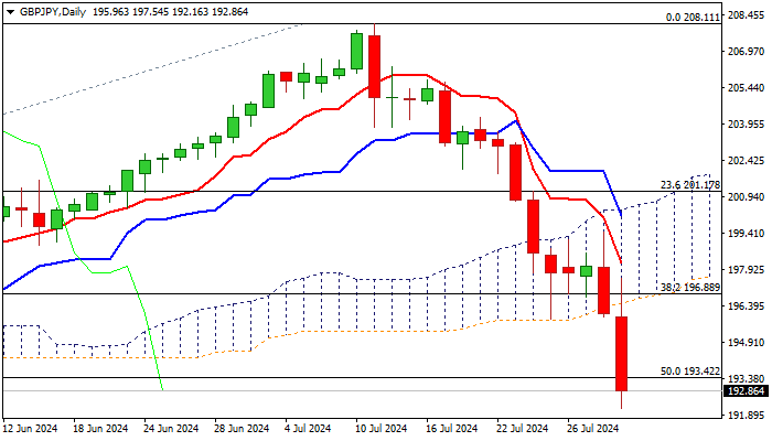 Fresh acceleration lower brought the price well below ascending daily cloud (spanned between 196.50 and 200.39) and broke below 50% retracement of 178.73/208.11 (193.42) to hit the lowest since early May.