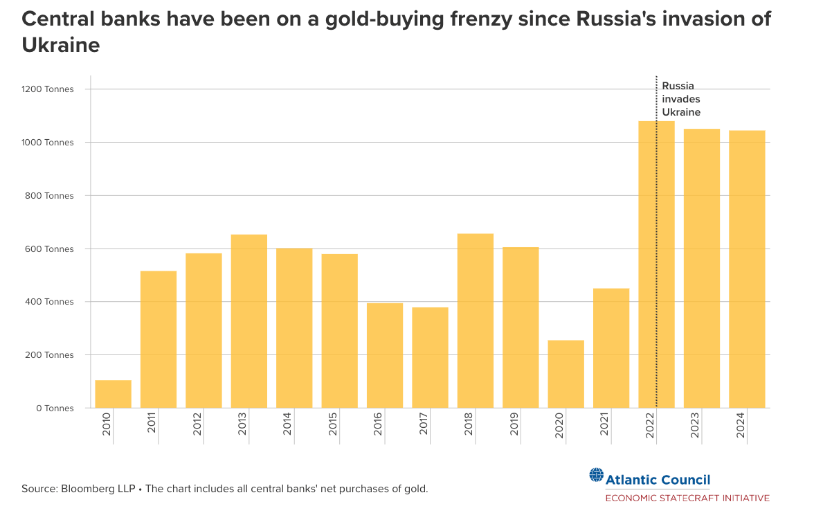 In an article published by the Atlantic Council, Kimberly Donovan and Maia Nikoladze point out that “central banks that are worried about getting sanctioned, want to protect themselves from a potential global financial crisis, or both have been stacking up gold at record levels.”