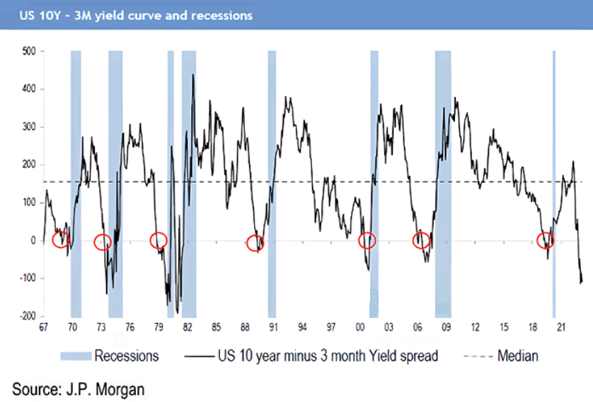 To explain, the black line above subtracts the 3-month T-Bill yield from the U.S. 10-Year Treasury yield. When the spread is negative, it means the short end of the curve is pricing in a more hawkish Fed, while the long end of the curve is pricing in the economic destruction that comes after.