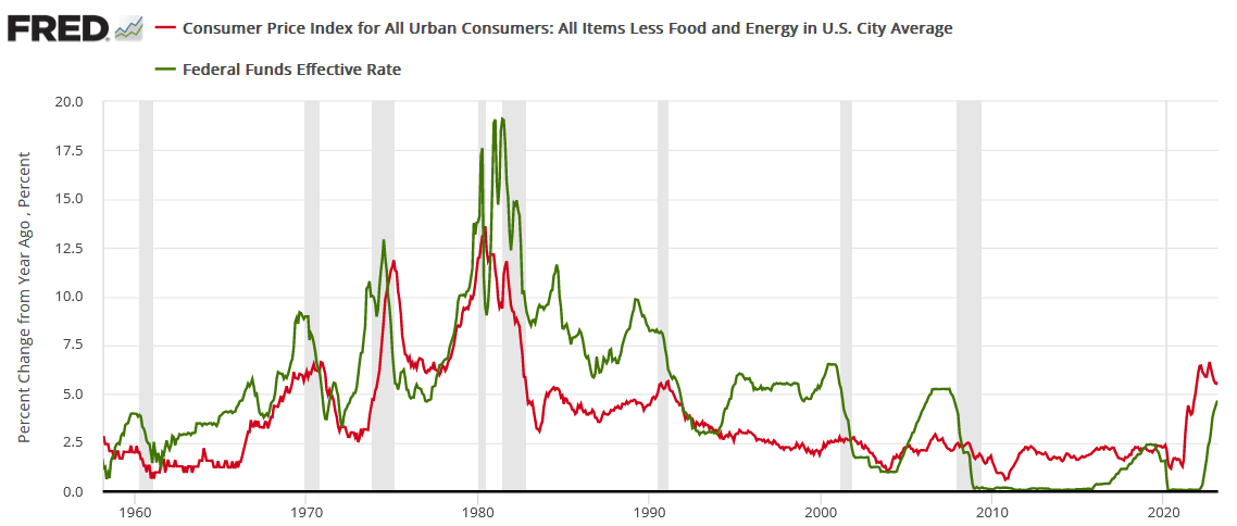 Finally, please remember that the U.S. federal funds rate (FFR) has eclipsed the peak YoY core CPI in every cycle since the 1950s. And with the latter peaking (for now) at 6.64%, history suggests the Fed is far from winning this war.