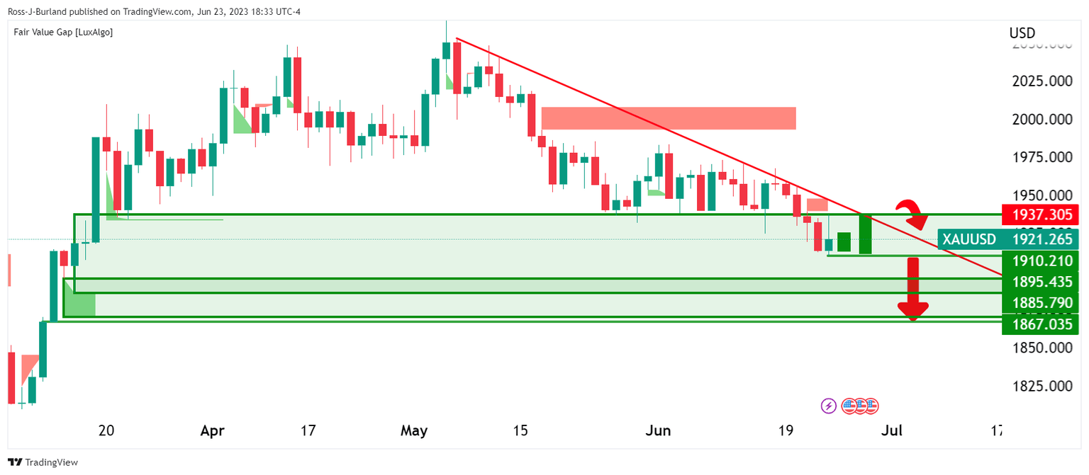 As per a series of analyses, including last week's Chart of the Week, Gold, the Chart of the Week: XAU/USD is coiled and breakout eyed, and Thursday's news article, Gold Price Analysis: Bulls eye a correction, US PMIs will be key, the price has behaved as poer the forecasting.
