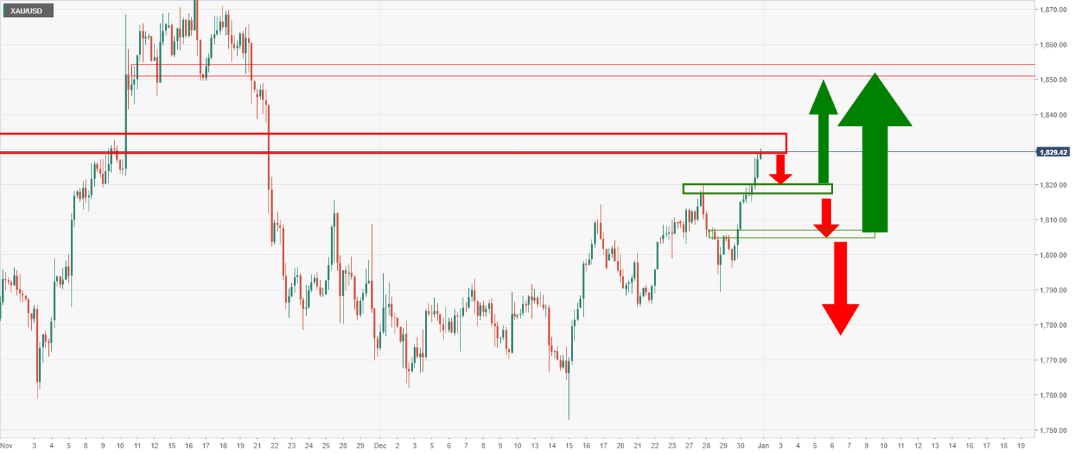 The price of gold surged during the holidays from around the $1,800 psychological level into the $1,830 area which would be expected to act as a resistance on initial tests. The following is a snapshot of the market's structure from a weekly, daily and 4-hour perspective: