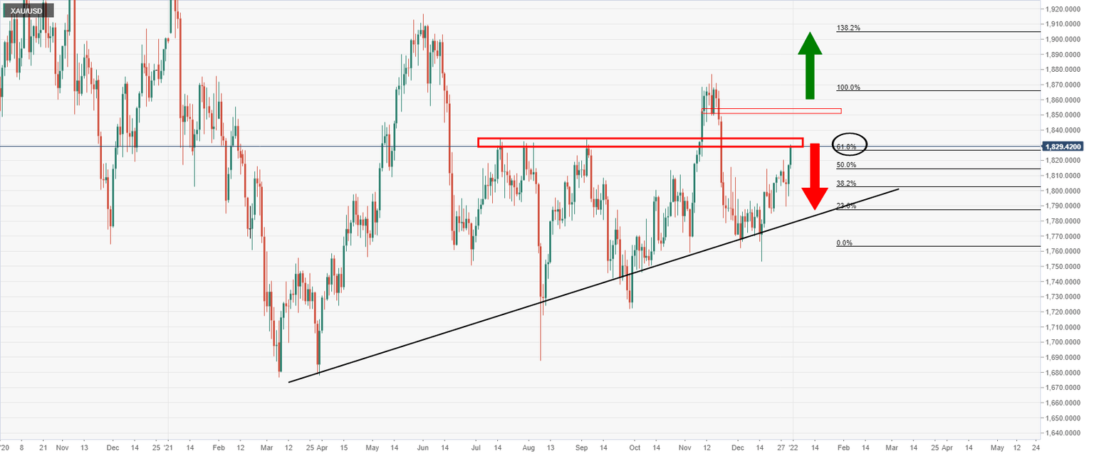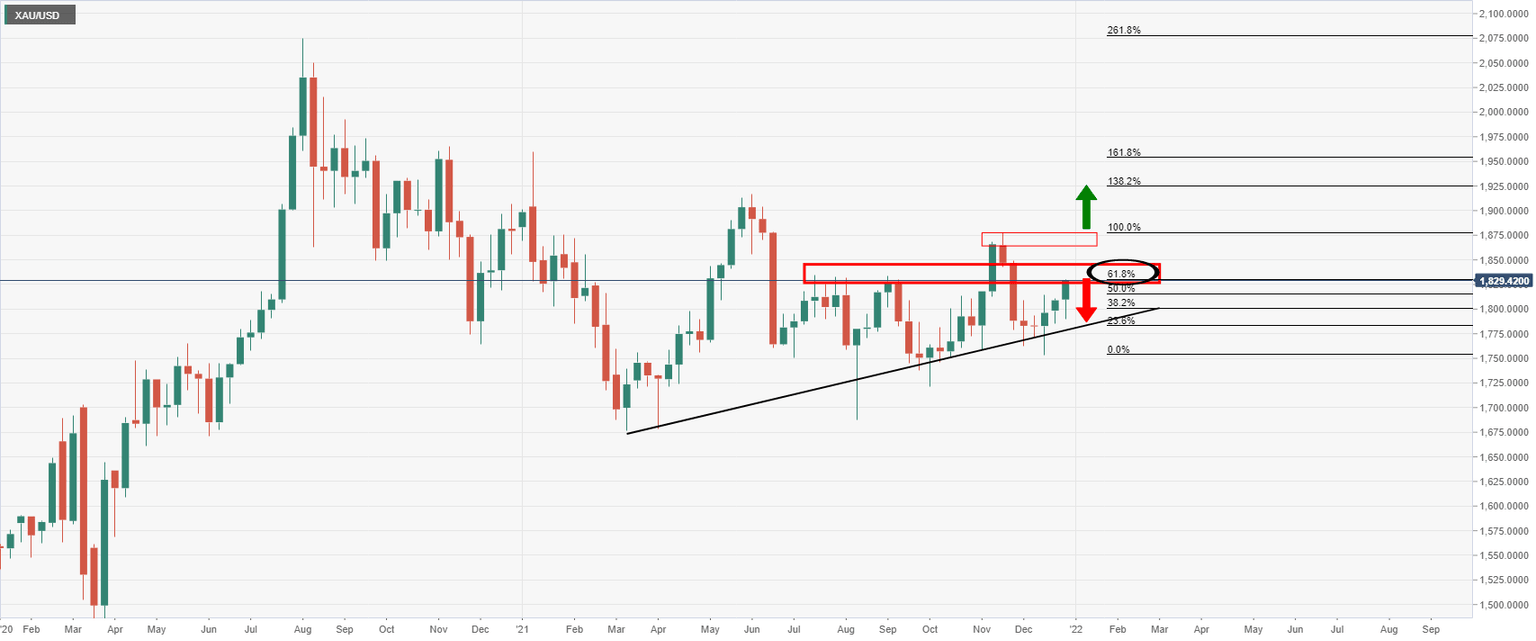 The 61.8% ratio is regarded as a significant prospect for a pivot in price action. In this scenario, bears could be looking for the area to hold and potentially result in an opportunity on the downside on lower time frames. However, should the resistance area give way, then bulls would be encouraged and the price would be expected to move towards the $1,850s.