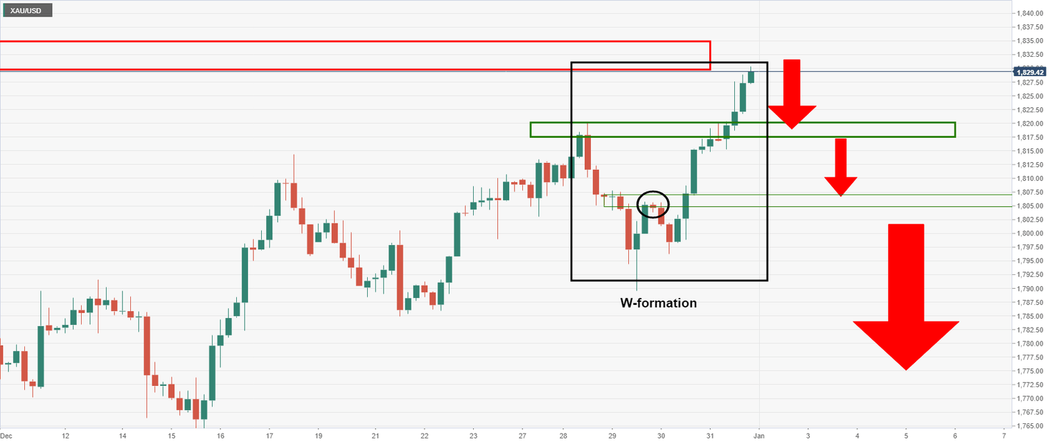 From a 4-hour perspective, the bulls are in charge although the resistance could see the price fail at first attempts for the open this week. In doing so, then $1,820 would be expected to act as support before $1,805 below there as per the neckline of the W-formation: