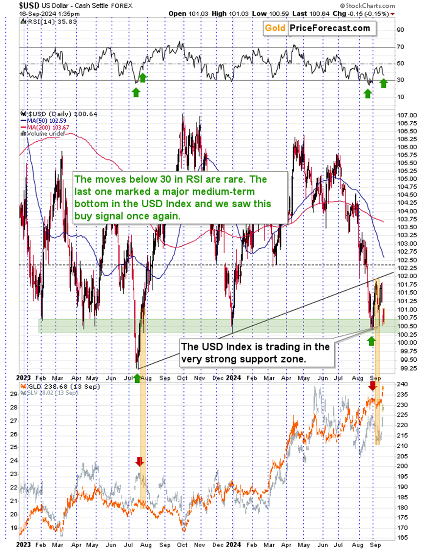 Consequently, we can indeed expect a rally in the USD Index based on the technical grounds and based on what seems likely given the approaching rate cut.