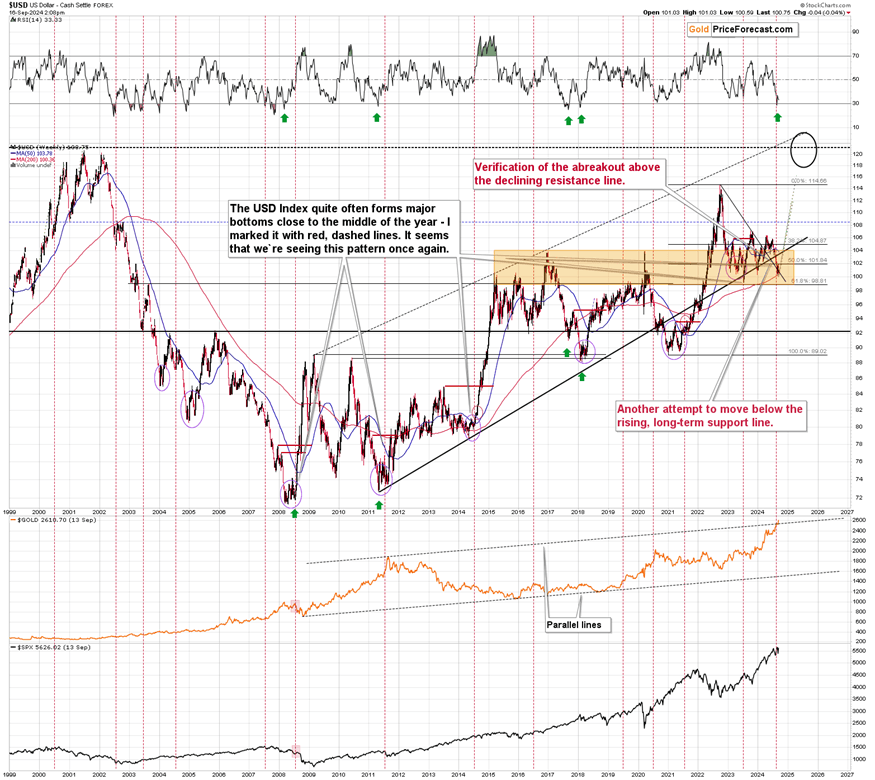 And… The thing is that based on the above chart and other charts, the USD Index is about to stop sliding and start rallying.