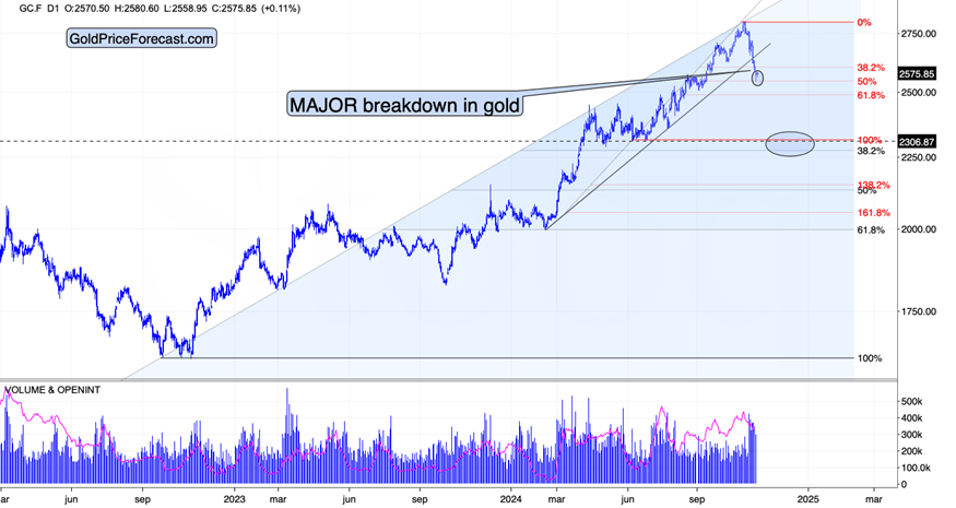 Second, the S&P 500 just invalidated the move above the very round (so, important from the psychological point of view) 6,000 level. This invalidation happened in terms of the closing prices, which makes it even more important than if we saw it just in intraday terms.