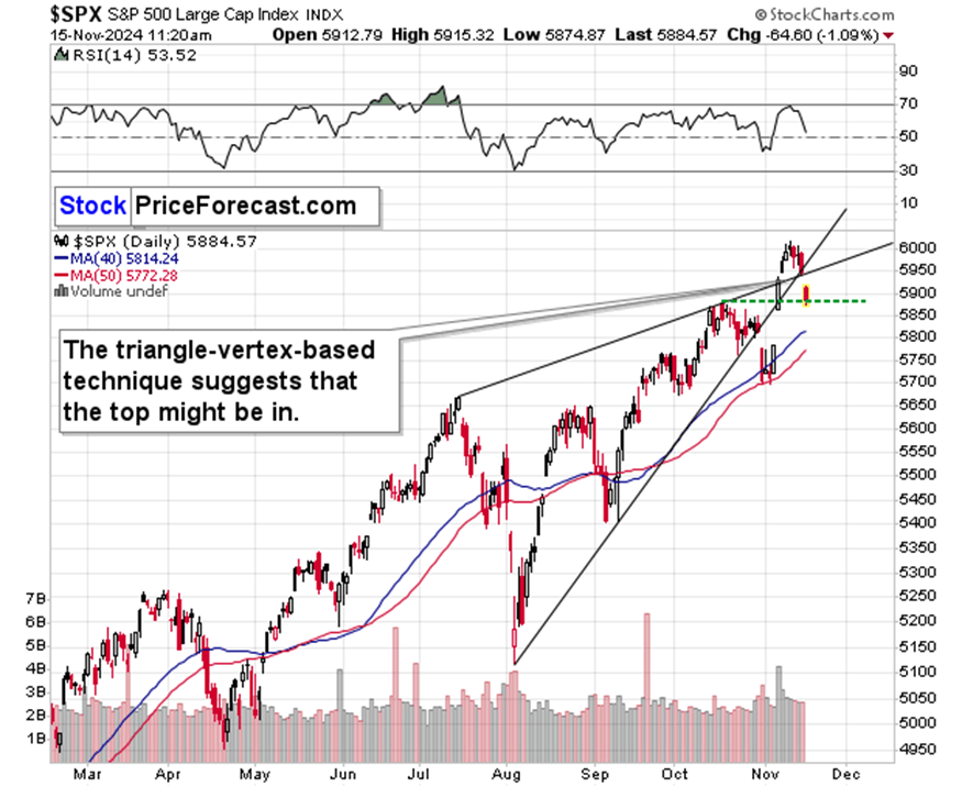 Indeed, the invalidation of the move above 6,000 and the triangle-vertex-based reversal triggered declines. And this might be the tipping point for the decline in the precious metals market and commodities. However, even if THE top was formed, we might still get a rebound as tops in stocks tend to be rather flat, with more than one smaller top creating them.