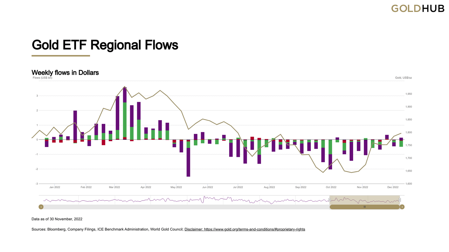 The chart below represents the change in Gold ETF - fully backed by physical Gold - flows in US Dollar terms from the beginning of the year until the end of November. Although this chart doesn’t yet point to a bullish bias, total outflows have been declining steadily since early October. Once there are consistent weekly inflows, this could be seen as a sign that ETFs are expecting prices to continue to increase.
