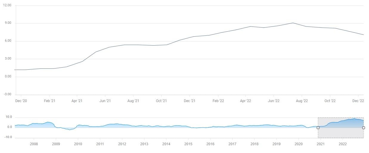 As of December 19, the CME Group’s FedWatch Tool shows that markets are pricing a 52.4% probability of the Fed opting for 25 bps hikes in February and March. If that were to happen, the policy rate will be 4.75-5%, slightly below the terminal rate projection in the dot plot. While speaking at the post-meeting press conference in December, FOMC Chairman Jerome Powell acknowledged that the peak rate could come down if inflation data continued to soften. Powell noted that they were expecting shelter inflation to recede in 2023 but added that inflation in the non-housing service sector, which is fundamentally related to the labor market and wages, was still uncomfortably high. Finally, Powell clarified that they were not thinking about cutting the policy rate in 2023 and reiterated that none of the policymakers had penciled in a rate cut next year in the SEP.