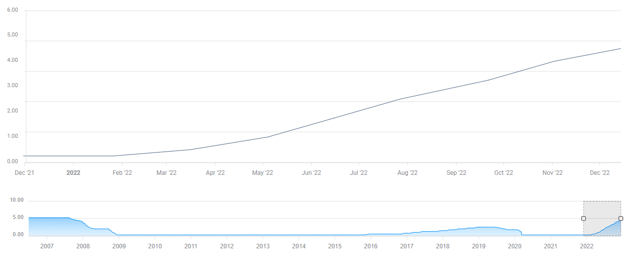 In the last quarter of the year, markets turned optimistic about the Fed taking its foot off the gas pedal after the annual CPI declined to 7.7% in October from 8.2% in September. Following the November policy meeting, the Fed stated that policymakers will take “cumulative tightening, policy lags and economic and financial developments” into account when determining the pace of rate hikes moving forward. Market participants began to price in a 50 bps rate increase in December. In turn, the 10-year US T-bond yield retreated toward 3.5% and XAU/USD gained more than 8% in November, snapping a seven-month losing streak.