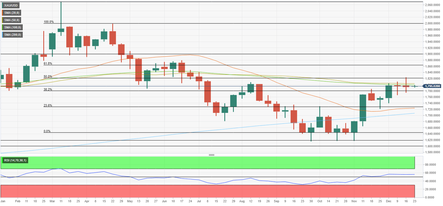 However, Gold price has failed to reclaim the 50 and 100-week SMAs that seem to have formed stiff resistance at around $1,800. Once XAU/USD stabilizes above those SMAs, it will need to flip $1,820 (Fibonacci 50% retracement of the March-November downtrend) into support in order to preserve its bullish momentum. Above that hurdle, $1,860 (Fibonacci 61.8% retracement) and $1,900 (static level, psychological level) could be seen as targets before XAU/USD finally aims for $2,000.