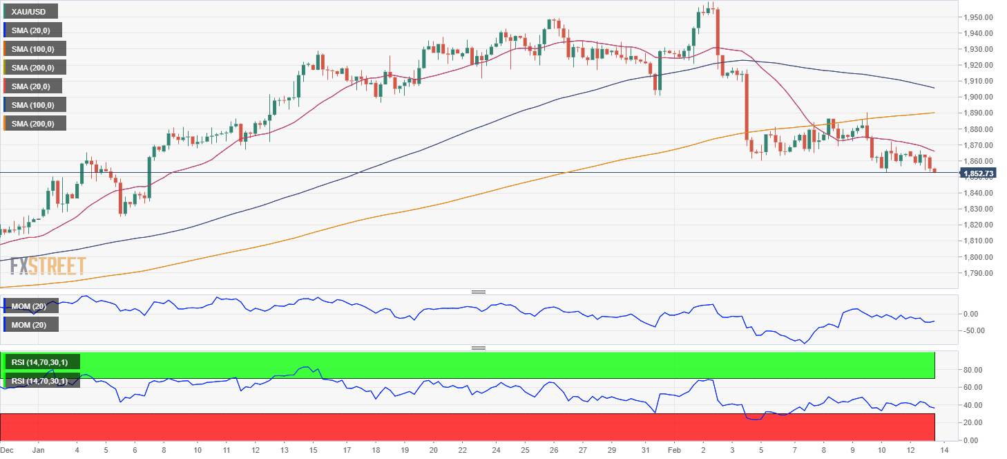 Spot gold is under pressure on Monday, pressuring a February low of $1,852.25, maintaining the downward bias despite easing demand for the US Dollar. The Greenback appreciated throughout the Asian session but preserved its strength only vs gold by Wall Street’s opening, as the positive tone of American indexes played against the USD.