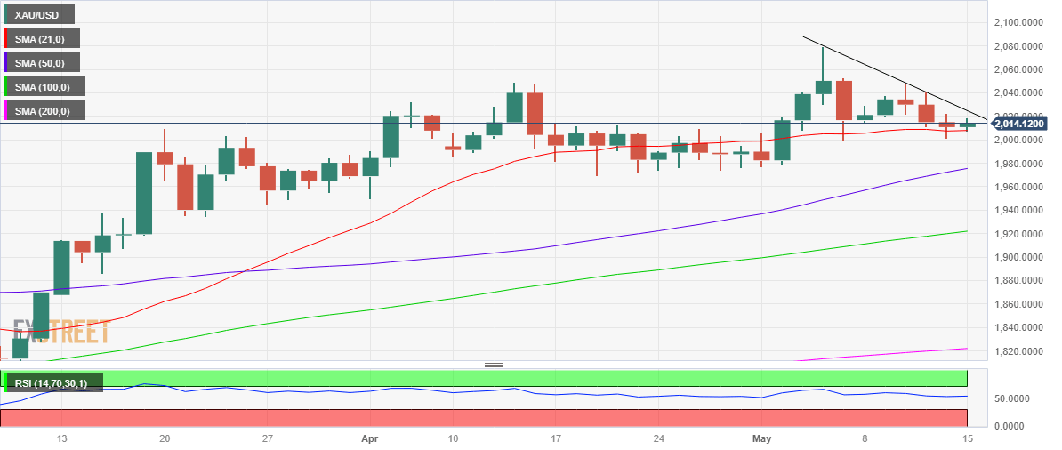 As observed on the daily chart, Gold price managed to defend the flattish 21-Daily Moving Average (DMA) at $2,008 weekly closing, motivating Gold buyers to kick off the week on the front foot.