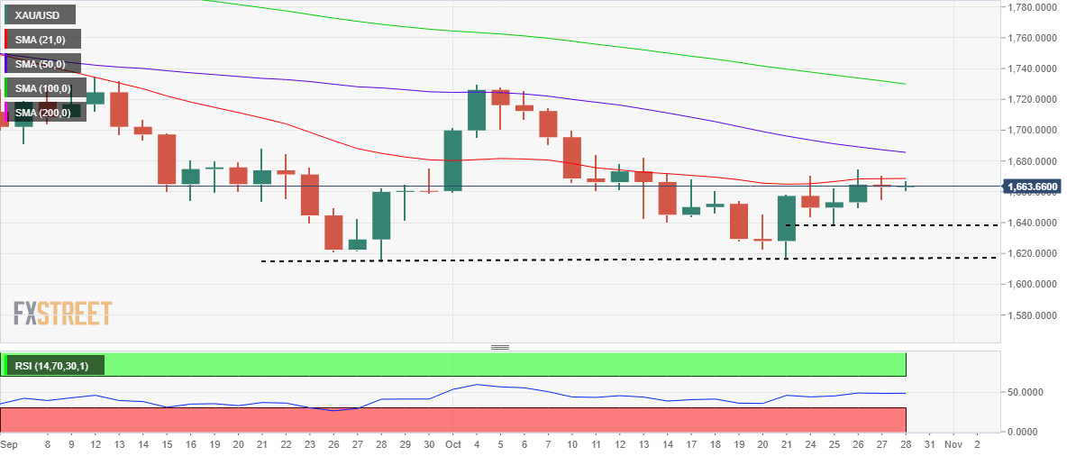On Thursday, XAU/USD price ended marginally lower around $1,664, having recovered from daily lows at $1,655 The US advance Q3 GDP outpaced expectations, rebounding 2.6% YoY vs. 2.4% estimates. The metal slumped in an immediate reaction to the data release, as the dollar staged a solid recovery. Gold bears were also helped by the ECB’s expected 75 bps rate hike announcement. The central bank, however, stuck to its stance that more tightening is needed while maintaining that they will remain data-dependent. The ECB policy announcements knocked down the EUR/USD pair, triggering a sharp rebound in the US dollar index. However, the renewed dollar upside failed to sustain amid a mixed perforrmance on Wall Street, as investors took note of earnings results.