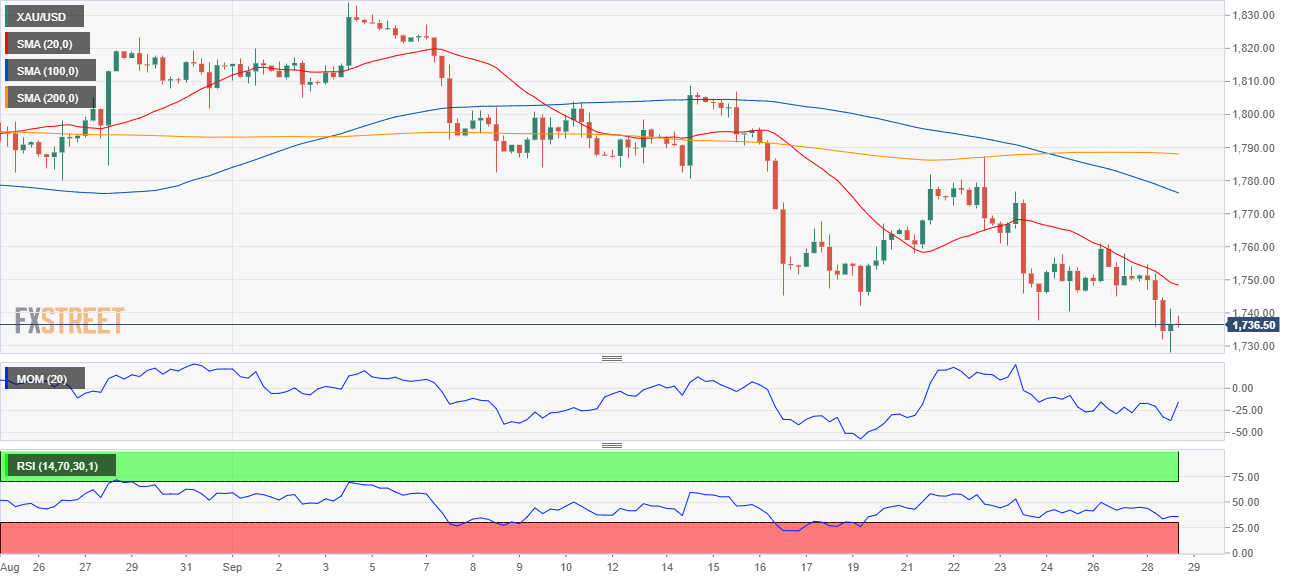 XAU/USD has bounced modestly and currently trades around $1,738 a troy ounce, firmly bearish according to the daily chart. The bright metal has fallen further below all of its moving averages, with the 20 SMA accelerating its slump below the longer ones. At the same time, technical indicators have resumed their declines within negative levels, with the RSI currently at fresh lows around 25.