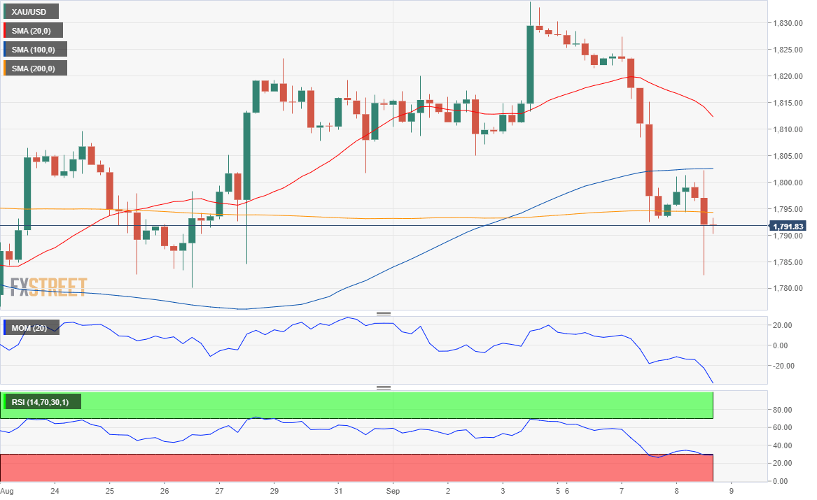- XAU/USD trades sub-1,800 and has room to extend its slump.