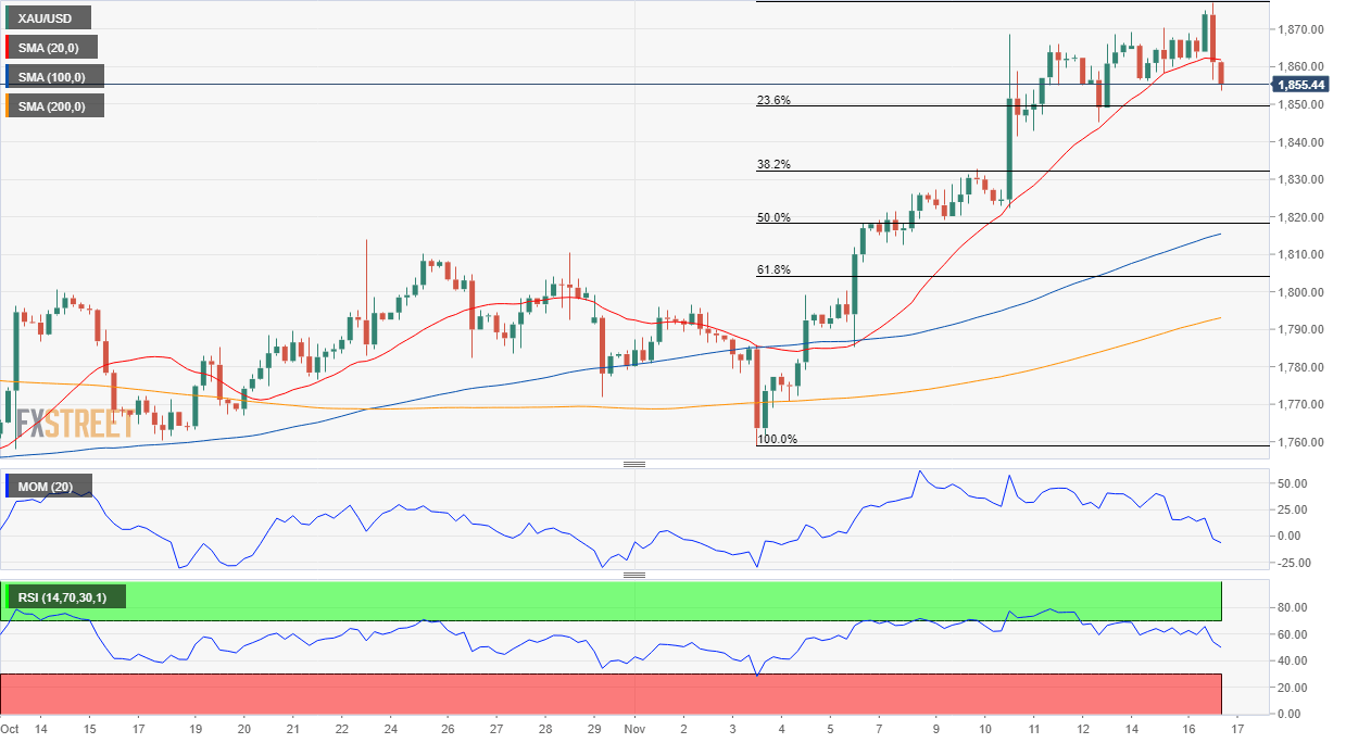 The 4-hour chart shows that the bearish potential remains limited, as technical indicators hold above their midlines, with the Momentum already bouncing from around its 100 level. At the same time, the price has pierced its 20-SMA, now directionless, while the longer moving averages maintain their firmly bullish slopes far below the current level. The 38.2% retracement of the mentioned rally and some intraday highs makes the 1,830 price zone a relevant support and an attractive level for bulls if it’s reached.