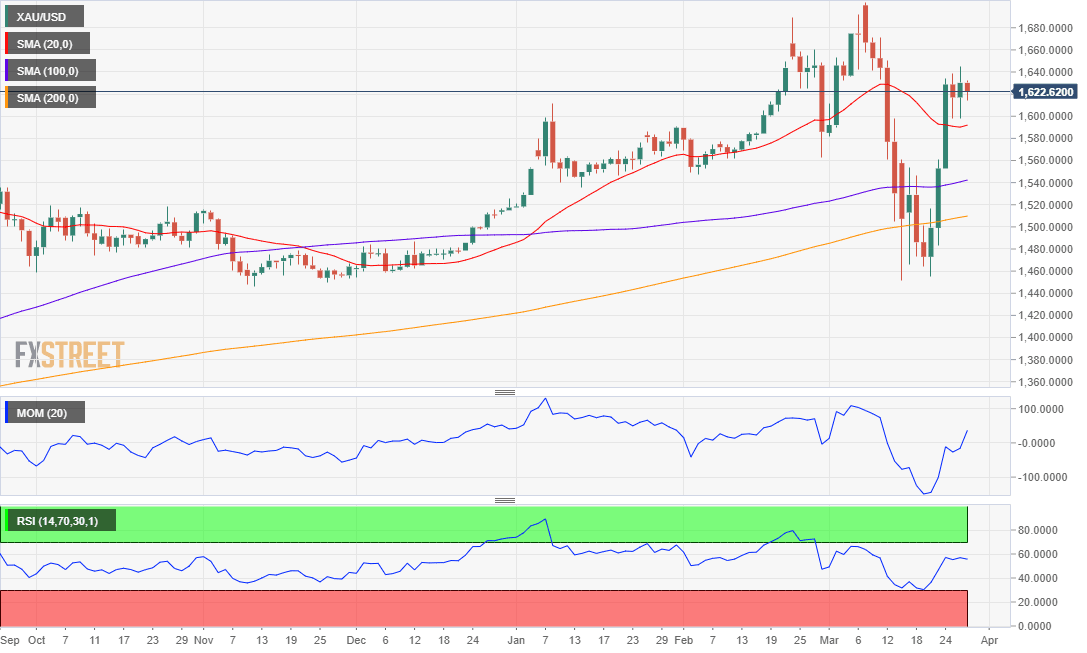 The weekly high at 1,643.90 is the immediate resistance ahead of 1,660. Beyond this last, spot has room to re-test the multi-year high at 1,703.18. The mentioned Fibonacci level provides support ahead of the daily 20 SMA. Below this last, the bearish case will be stronger, with the 1,500 level at sight.