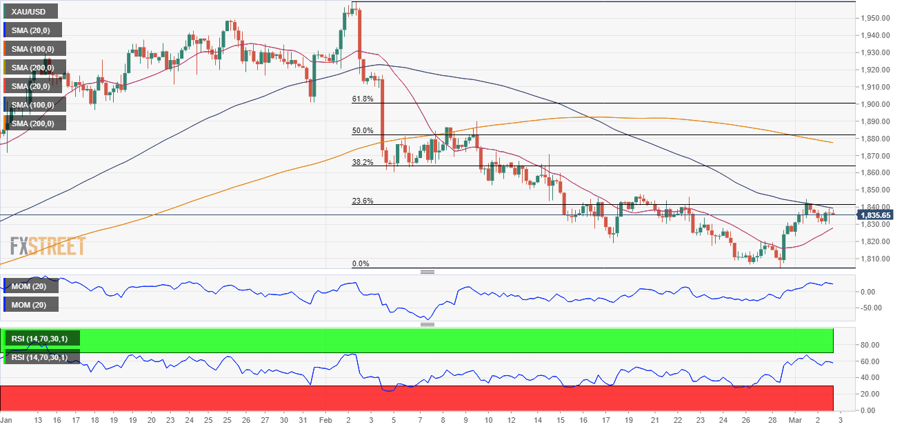The XAU/USD pair trades at around $1,835, just below the 23.6% retracement of the $1,959.75/$1,804.70 decline at $1,841.04. Buyers are struggling to overcome the level and push the metal towards the next Fibonacci resistance level at $1,863.70.