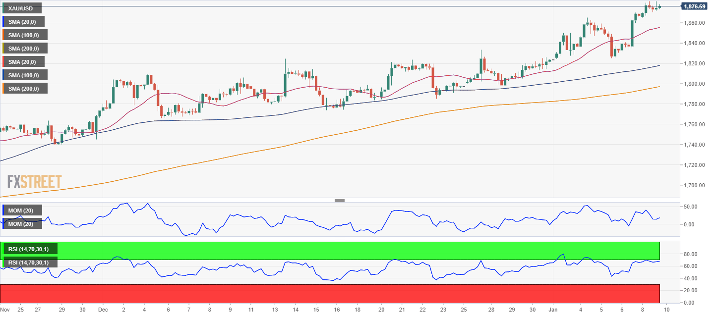 XAU/USD trades near daily highs in the $1,870.00 price zone, retaining its bullish strength according to the daily chart. Technical indicators lost their upward momentum after nearing overbought readings, holding ground mid-US session. At the same time, the bright metal extends its advance above its moving averages, with the 20 Simple Moving Average (SMA) gaining upward traction and providing dynamic support at around 1,815.00.