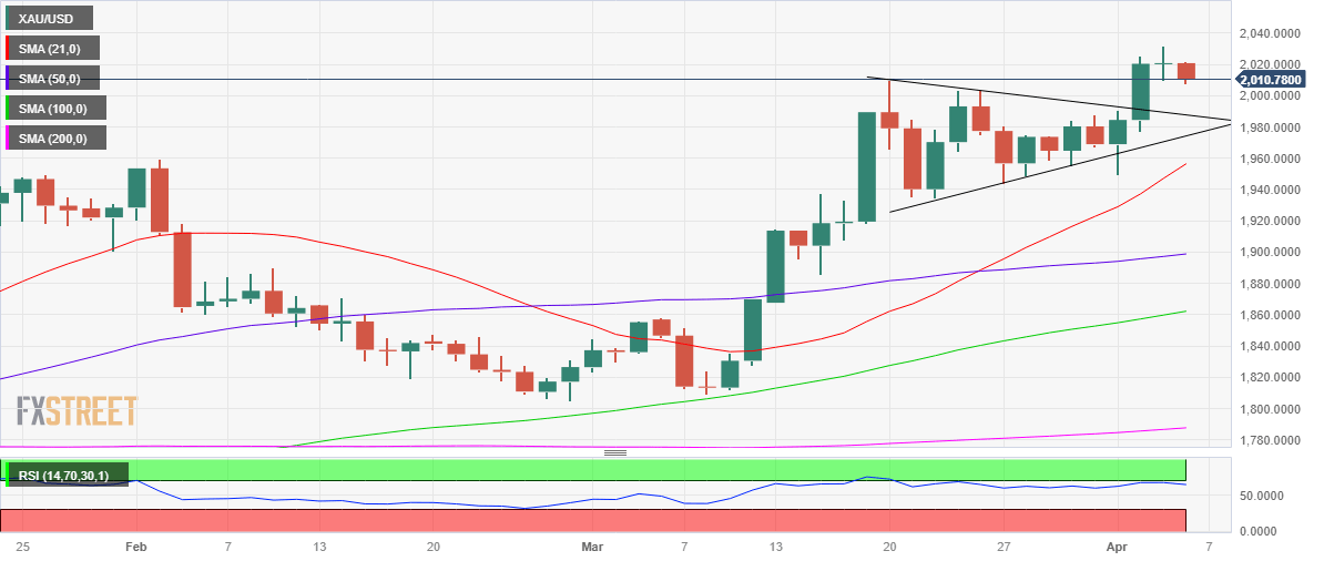 - Gold price pulls back from 2023 highs above $2,000 as US Dollar rebounds.