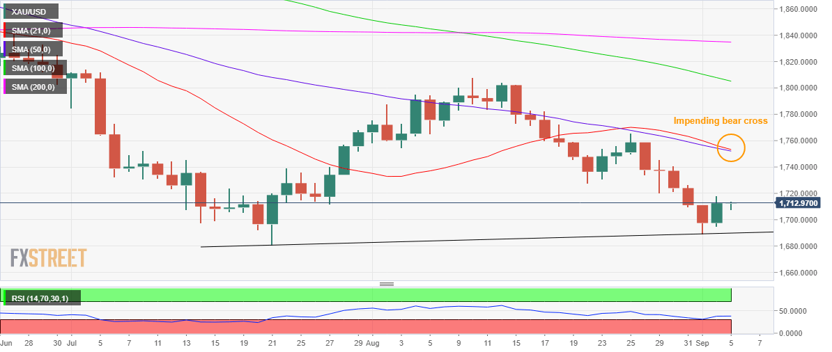 The next cushion is seen at the rising trendline support at $1,690. Should the decline accelerate below the latter, a test of the 2021 low of $1,677 will be on the table, below a break of the yearly lows.