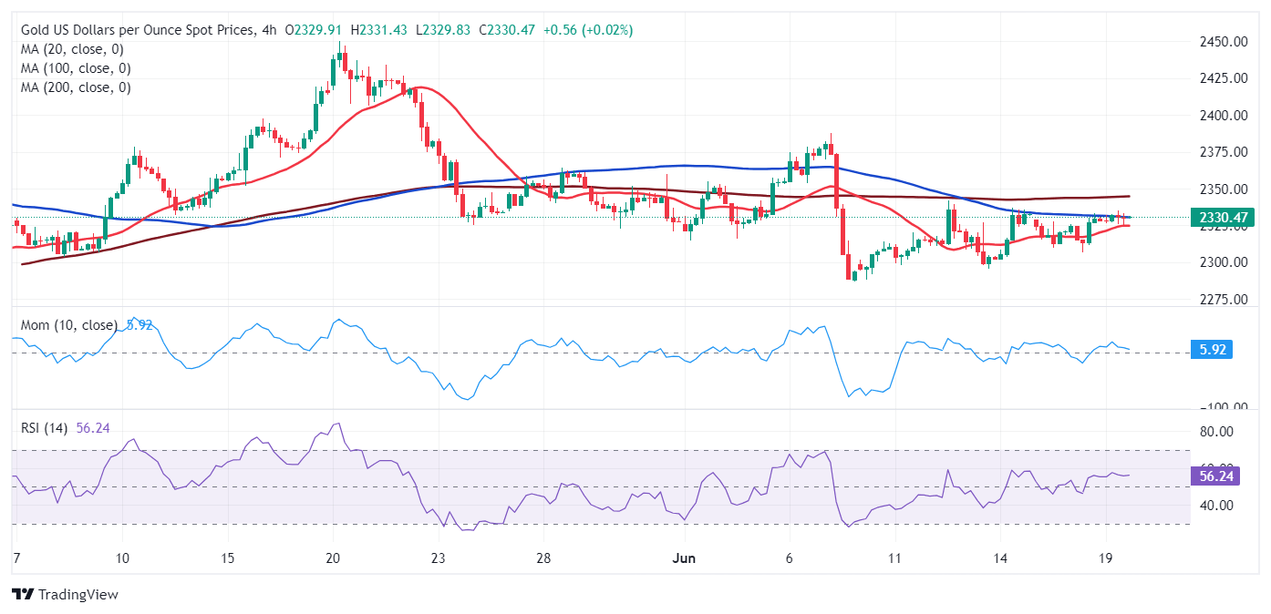 According to the 4-hour chart, XAU/USD is neutral in the near term. A mildly bullish 20 SMA provided intraday support at around $2,325, but sellers rejected advances around a marginally bearish 100 SMA. The 200 SMA, in the meantime, remains far above the current level, lacking directional strength. In the meantime, technical indicators rest just above their midlines, unable to provide directional clues.