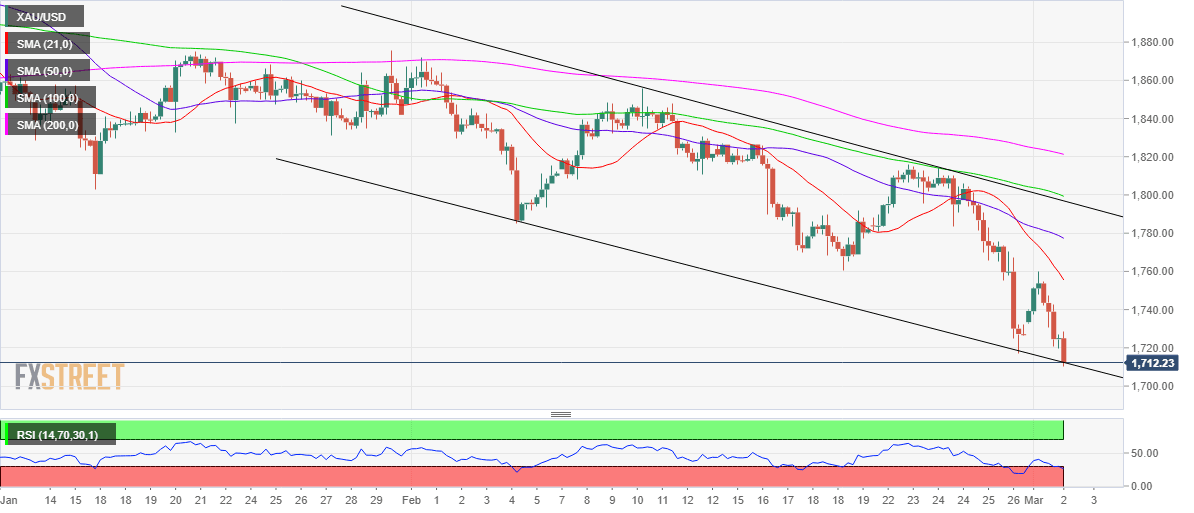 The Relative Strength Index (RSI) trends in the oversold territory, suggesting that the XAU bulls could attempt a corrective pullback from nine-month lows of $1710.50.