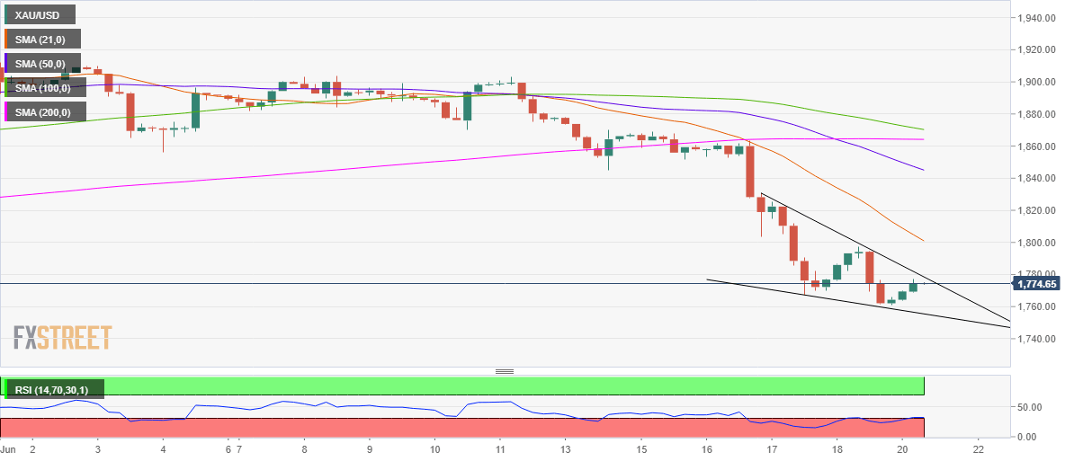 Gold price (XAU/USD) extended its six-day losing streak on Friday and reached the lowest levels in two months at $1761, recording a 6% loss on a weekly basis. Gold bulls faced rejection below the $1800 mark in the first half of the day, resuming the downtrend. The Fed’s hawkish turn smashed gold while lifting the US dollar to two-month highs across the board. Hopes for sooner-than-expected Fed rate hikes dented gold’s appeal, as it considered a non-interest-bearing investment asset. However, weaker US Treasury yields helped gold price stage a modest recovery heading into the weekly closing. Meanwhile, investors digested the conflicting comments from the Fed policymakers.