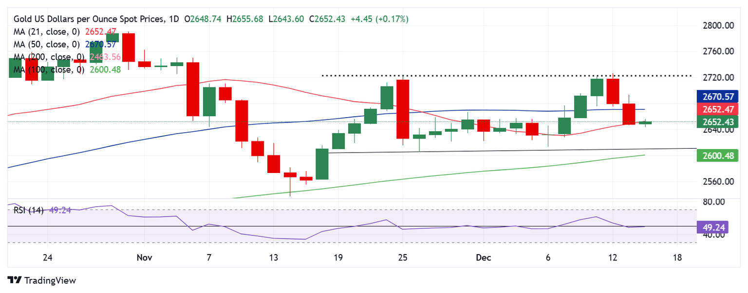 As observed on the daily chart, Gold price is battling the 21-day Simple Moving Average (SMA) support at $2,650.